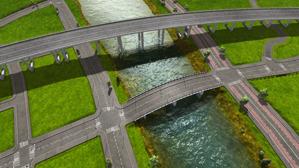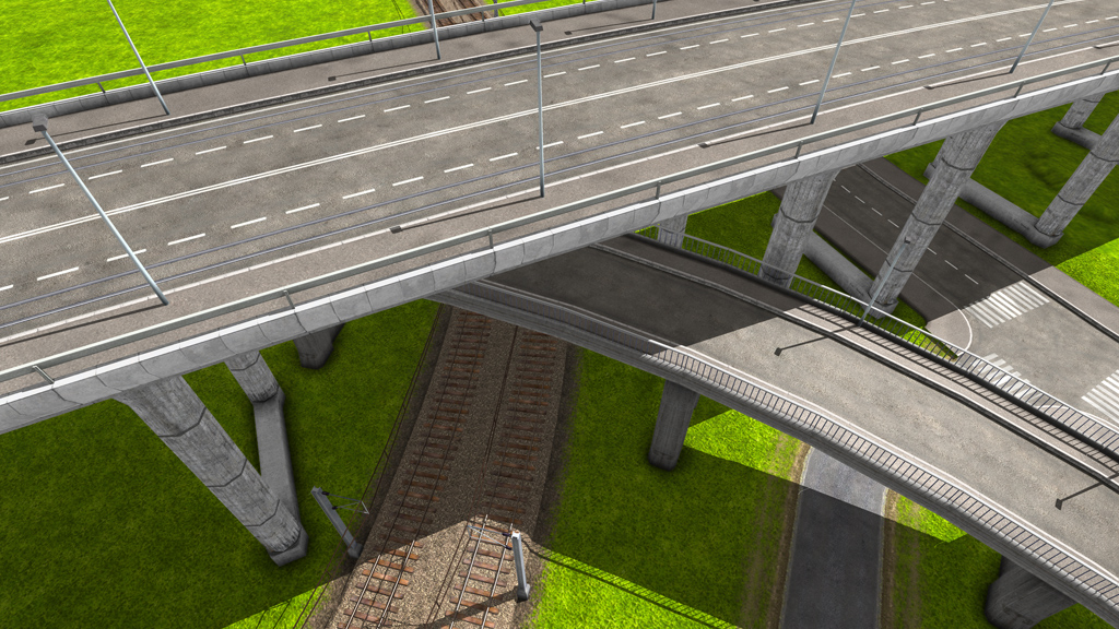 The image on the right illustrates bridges on multiple levels. There is no limit for constructions as long as enough space for the bridge pillars is available. You can also see railroad tracks on the right image. This is what we feature in the next update!